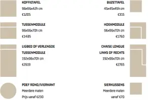 Starting with the most important thing, the lounge sofa. To put together your unique lounge set, you can choose from 7 modules that you can use multiple times of course. all lounge sets are 70 cm high as usual. The different modules are: