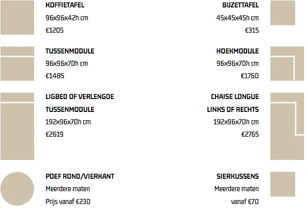 Starting with the most important thing, the lounge sofa. To put together your unique lounge set, you can choose from 7 modules that you can use multiple times of course. all lounge sets are 70 cm high as usual. The different modules are: